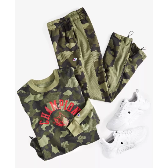 An allover camo print gives these Champion jogger pants and sweatshirt a sporty, memorable look to complement their exceptional comfort.