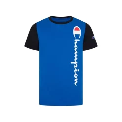 - Champion script on back neck tape; C logo on sleeve; Champion graphic on front